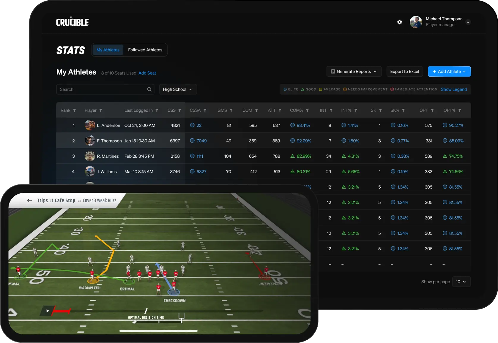 Crucible helps you professionalize your coaching operation while sharpening the mental side of your athletes' development. By blending measurable data with cognitive training and decision analysis, you deliver results athletes and parents can see. You'll create new revenue streams, strengthen retention, and stand out as a tech-forward leader in quarterback development.